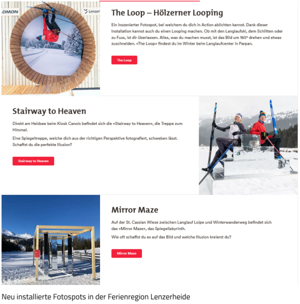 Die Schweizer Ferienregion Lenzerheide will sein Image und den Skilanglauf mithilfe von kreativen Motiven aufbessern, besonders bei der jüngeren Zielgruppe. Hierfür wurden verschiedene Fotospots kreiert und installiert. Damit geht die Region einen Schritt weiter als mit den bisherigen Kampagnen, die vordergründig den Fokus auf Kommunikation gelegt haben. Von der neuen Kampagne versprechen sich die Macher:innen mehr Authentizität, Zielgruppengenauigkeit und Glaubwürdigkeit durch user generated content.5
